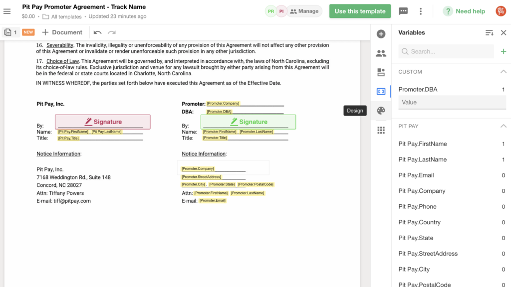Click on the appropriate template – “Pit Pay Promoter Agreement – Track Name” or “Kart Pass Promoter Agreement – Track Name” or “Ticket Hoss Promoter Agreement – Track Name” to open the template, make sure it’s the right one