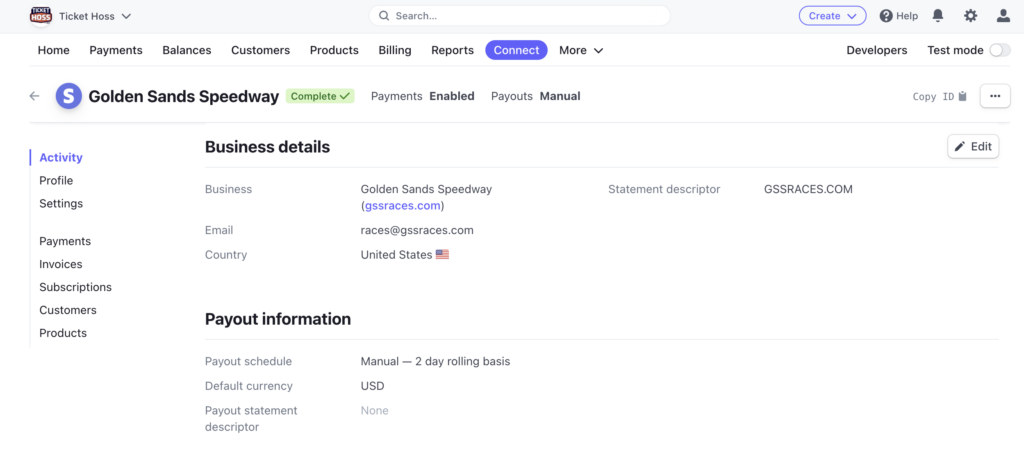 All Stripe connected accounts are setup through either the Pit Pay, Kart Pass or Ticket Hoss Dashboards.