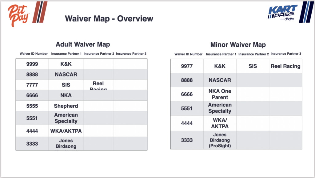 Here is an overview of the current waiver map for Pit Pay and Kart Pass: